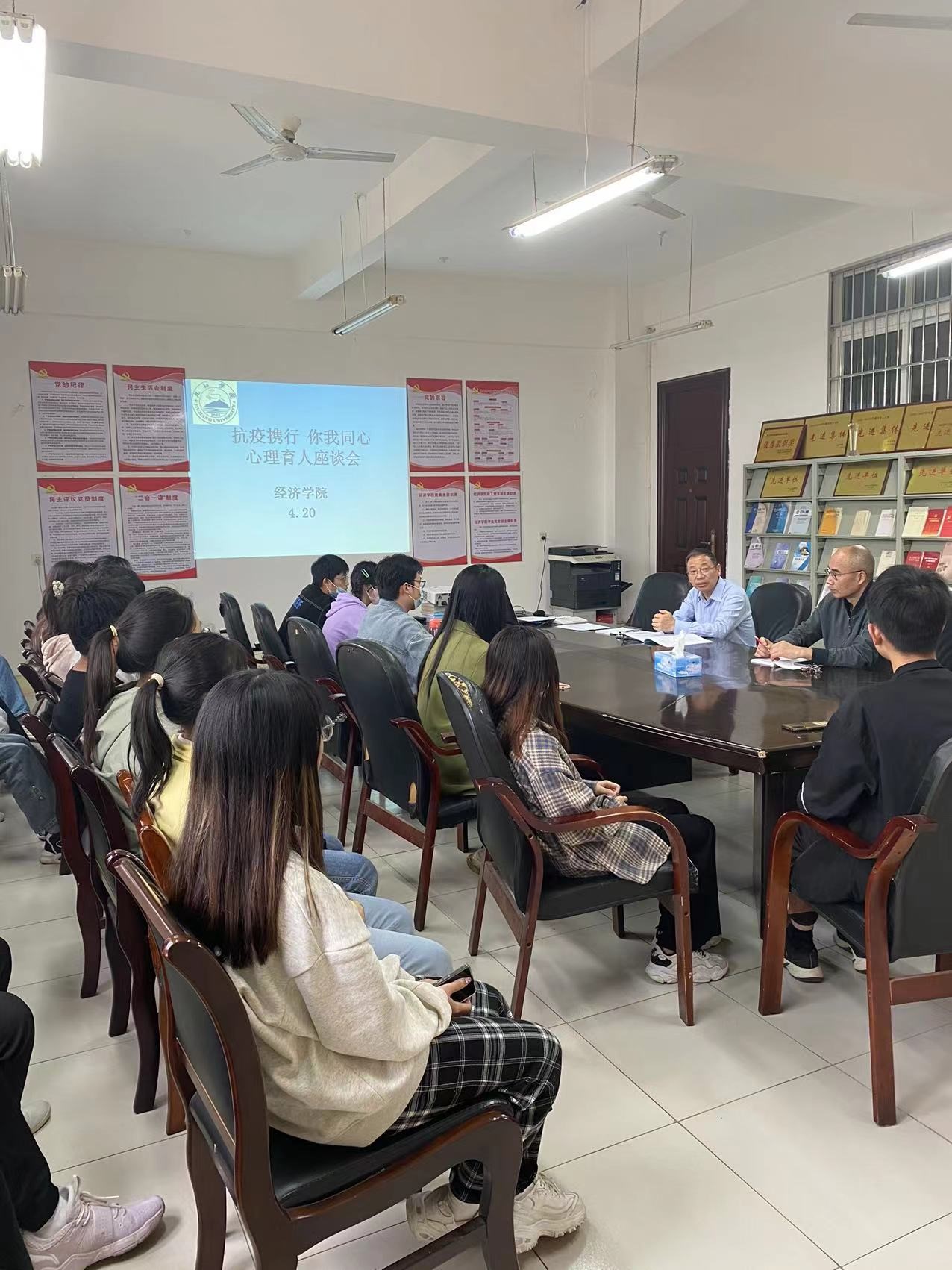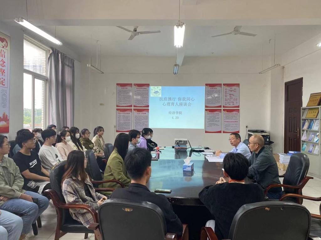 4月20日下午永利y23455在义丰楼619开展“抗疫携行 你我同心”心理育人座谈会。学院党委书记漆晗东、副书记谢忠、心理工作负责人丁春、各班心理委员参会。