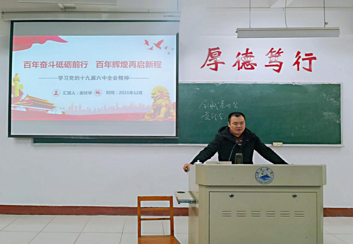 为深入学习贯彻党的十九届六中全会,深入领会全会的精神内涵,12月14日下午,永利y23455于义丰楼教室组织召开了党的十九届六中全会精神宣讲会。本次宣讲会由马克思主义学院老师谢伏华主讲,永利y23455A2121班和A2122班全体同学参加。
