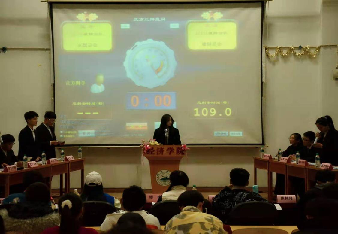 为丰富同学们的大学生活,增强语言表达能力,11月25日晚,永利y23455于文友楼三楼报告厅组织举办“经济杯”辩论赛。此次比赛由学习部主办,大一全体同学参加,特邀指导老师谭梅、校辩队队长朱焱、永利y23455辩论队队长张其月、学生会副主席翟婵、学习部部长邓俊杰担任评委。