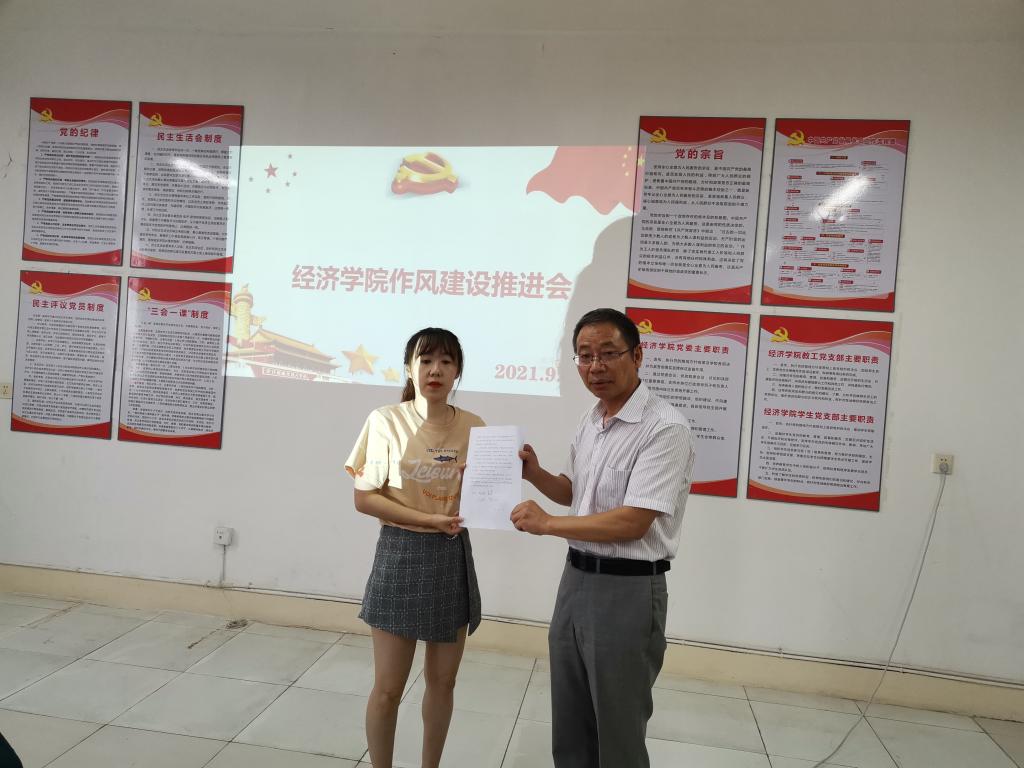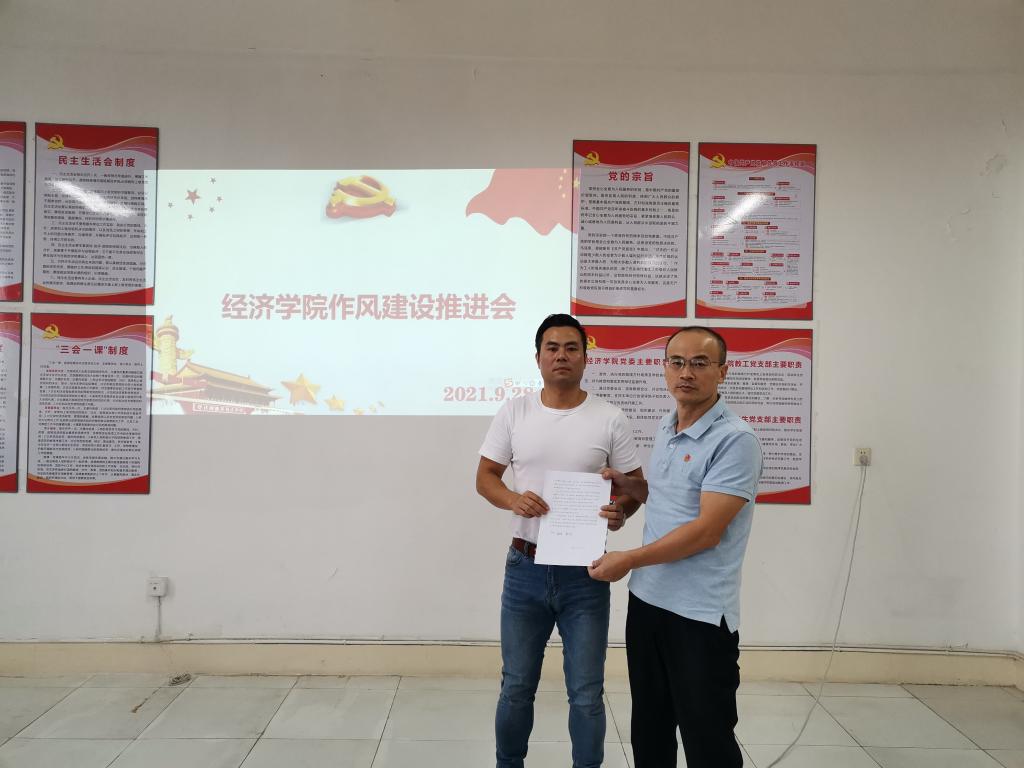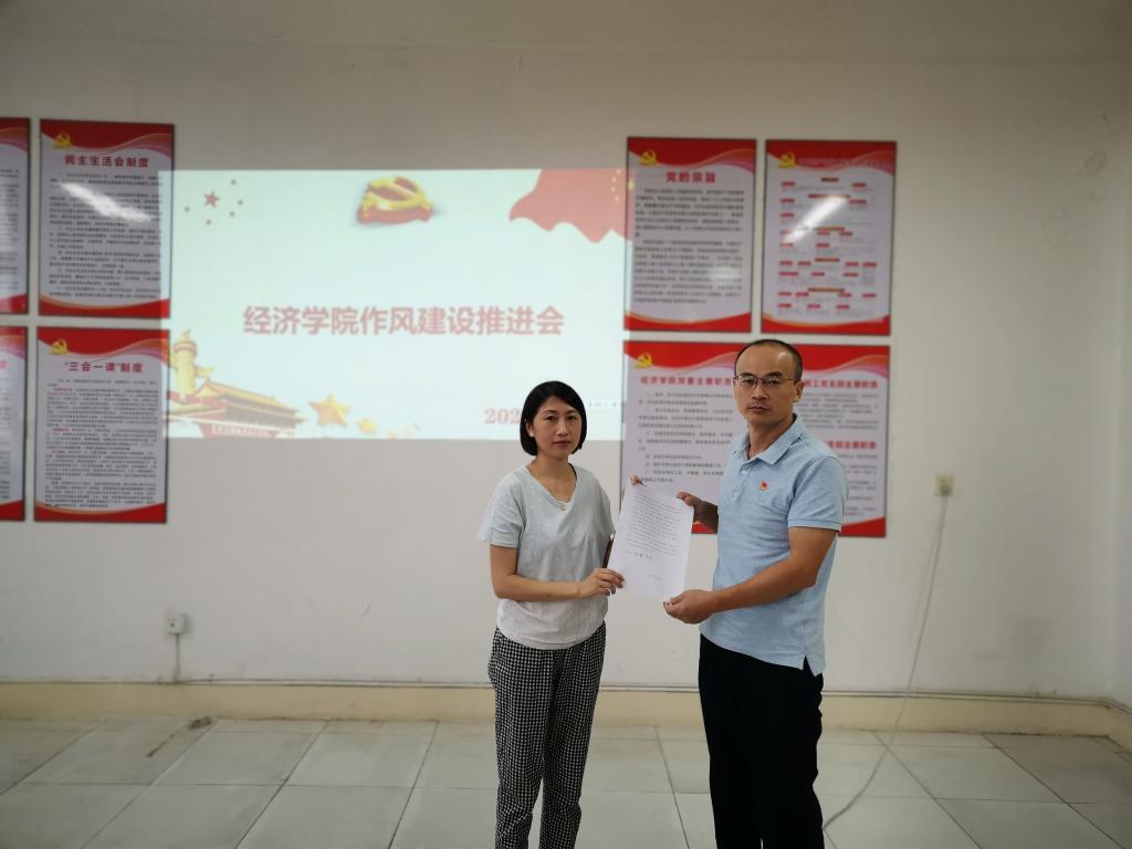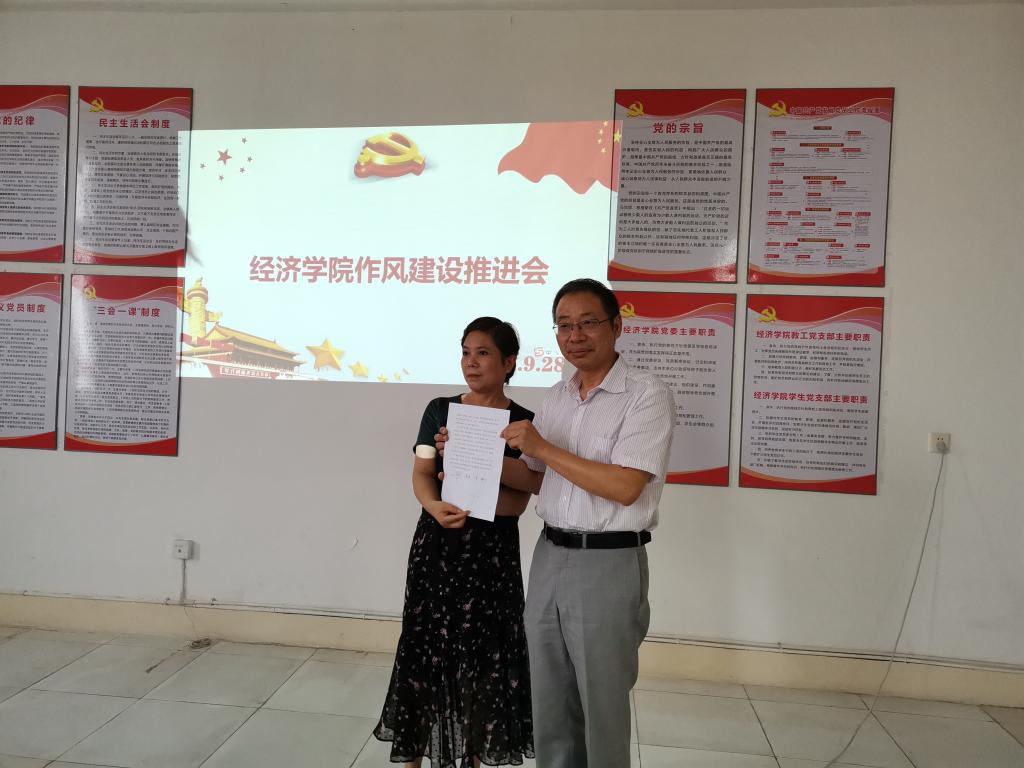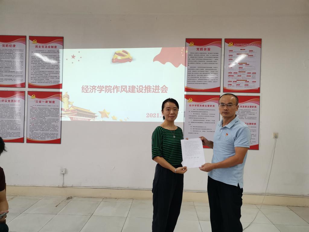 会上,举行庄重的承诺书签名仪式。办公室负责人饶凯传达了《永利y23455加强作风建设实施细则》文件精神,张冬霞老师宣读《永利y23455改进工作作风集体承诺书》。以科室为单位,所有与会人员在承诺书上签名。
