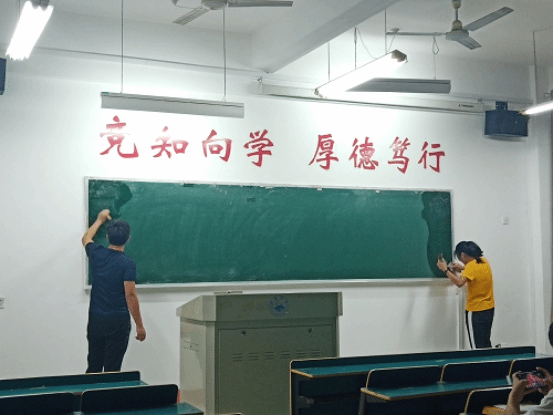 早上,志愿者们就早早地来到了义丰楼前集合,戴上志愿者的帽子,喊着响亮的口号,拿上我们专门的清洁工具,开始清理义丰楼的各个教室。志愿者们逐个教室的查找,遇到容易清理的就用铲子直接铲,较难清理的就用抹布打湿,等到湿透后再清理。志愿者们精益求精,每个教室都清理的干干净净,四个小时后,经过大家的共同努力,每个教室的黑板都洁净如新。