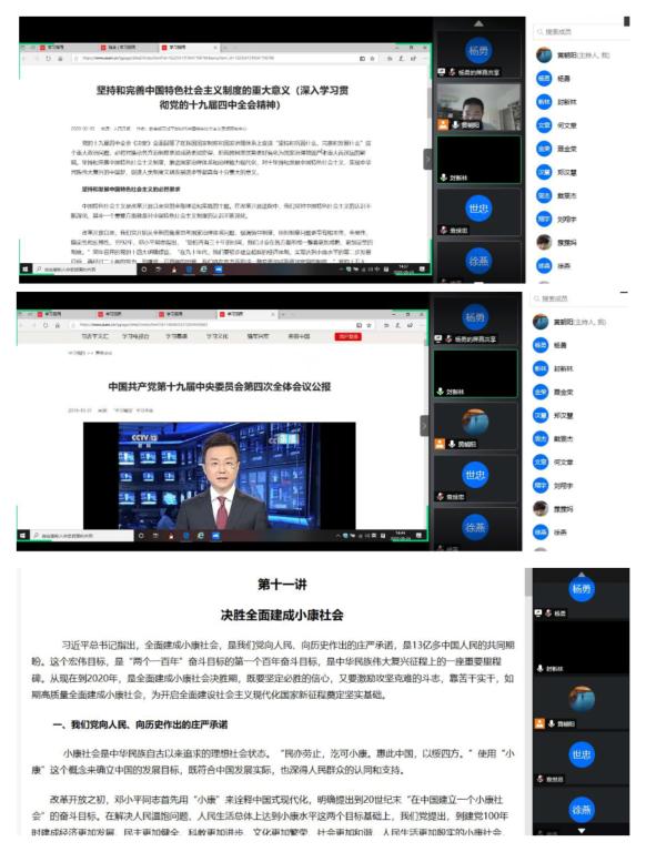 6月17日下午于义丰楼607工商管理教研室对《习近平总书记在专家学者座谈会上的重要讲话精神》《习近平总书记两会期间重要讲话精神》《习近平总书记在中央政治局第二十次集体学习时的讲话》的集中学习之后,6月24日下午14:30始,通过腾讯视频会议方式,经管学院教工第五支部及所在教研室党员与非党员教师线上集中学习了《党的十九届四中全会精神》和《习近平新时代中国特色社会主义思想三十讲(十一至十八讲)》。