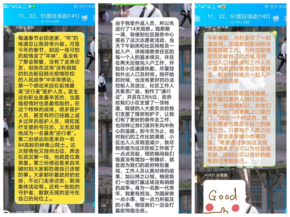 这次主题团课主要是在各班级的QQ群中展开,首先由团支书向同学们介绍了防范病毒的方法以及一些在与病毒作斗争的过程中出现的感人事例,同学们也从中学习了一线抗疫工作者“无私奉献,舍己为人”的感人精神。此后,我们找来参与防疫的同学在群里给大家分享了一些自己在防疫工作中的经历,大家也纷纷对这些行为点赞。在活动接近尾声时,同学们也说出了对此次主题团课的感想“每个人都是平凡而伟大的,没有谁生来就是战士”“哪有什么岁月静好,只是有人替我们负重前行罢了”等等。最后,同学们不约而同地在群里说到“武汉加油,中国加油!”一次意义非凡的主题团课便在这一阵阵暖心的加油声中结束了。