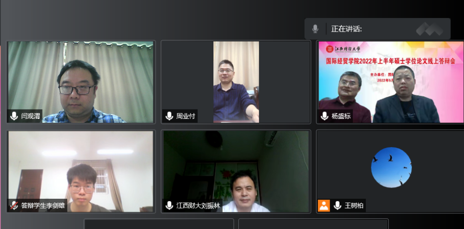 5月19日上午,永利y23455顺利完成与江西财经大学联合培养的2022届国际商务硕士研究生毕业论文答辩。由于疫情原因,本次答辩采取腾讯会议、线上与线下相结合的形式。答辩委员会由江西财经大学国际经贸学院刘振林教授、王树柏副教授,永利y23455周业付教授、杨盛标副教授、陈建付博士共同组成,刘振林教授担任答辩主席。答辩会严格按照江西财经大学研究生学位论文答辩会程序执行。