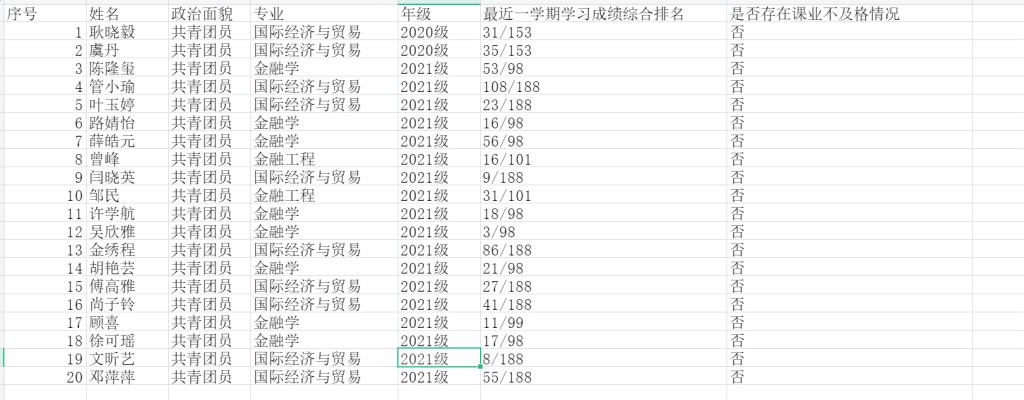 7.工作人员中除一年级新生外的本专科生最近1个学期/最近1学年/入学以来三者取其一,学业成绩综合排名在本专业前30%以内,且无课业不及格情况。 |