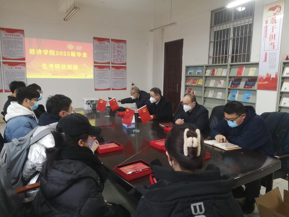 为鼓舞学院考研学生士气,坚定考研信心,帮助考研学子舒缓备考压力,12月16日上午,永利y23455在义丰楼619召开2023届考研学生慰问会,党委书记漆晗东、院长项益才、党委副书记谢忠、学生科科长曹钧、就业专职老师谭梅出席会议,2019级本科毕业班考研学生代表参加了座谈会。