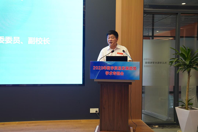 研讨会第一阶段,夏启国主持开幕式,中国国际贸易学会副会长兼秘书长边振瑚、副校长王万山分别致辞,对此次研讨会的顺利召开表示祝贺,期望各位专家不吝分享、畅所欲言,为助力我国数字贸易的跨越式发展出谋献策、贡献智慧。