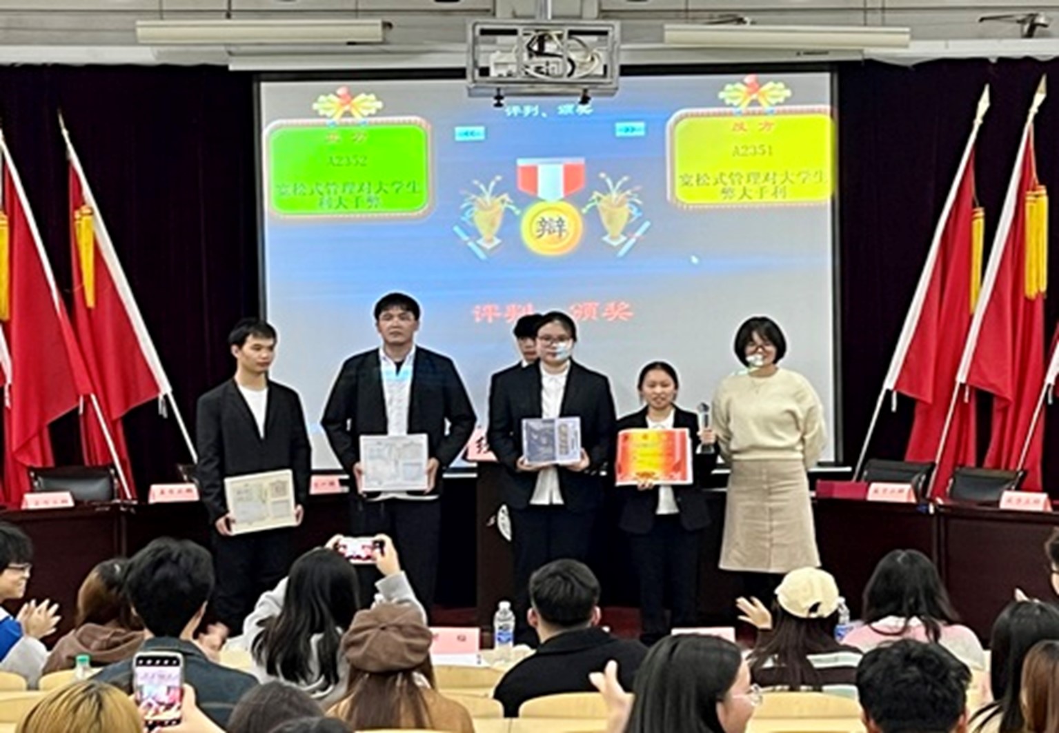 A2352班正方就宽松式管理对大学生影响利大于弊的论点,通过列举事例的方式进行论证,正反结合,形象具体地开篇立论。A2351班作为反方,则利用调查数据及理论知识进行充分有力地反驳,双方一攻一守,辩论迅速进入白热化阶段。经过四轮精彩绝伦地驳论,最终在各大评委的详细点评,与投票选判下,A2351班反方胜出本场辩论赛。