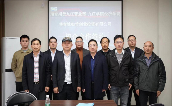 为进一步强化学院应用型人才培养资源建设,11月15日,永利y23455与瑞奇期货公司九江分公司、共青城如竹创业投资有限公司共建金融类专业校外实践教学基地签约仪式在九江瑞奇期货公司本部举行,学院副院长李华、瑞奇期货九江营业部总经理朱学群、共青城如竹创业投资有限公司总经理秦阿民共同签约。