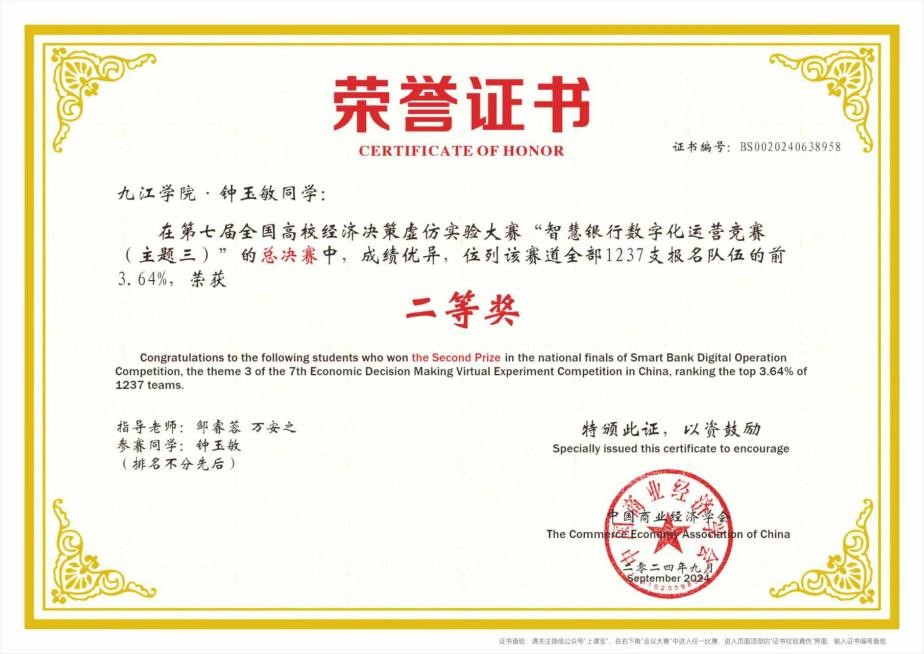 近日,第七届全国高校经济决策虚仿实验大赛“智慧银行数字化运营竞赛”全国总决赛落下帷幕。最终我院学子凭借过硬的理论知识、出色的运营能力斩获全国一等奖1项、二等奖1项、三等奖3项。