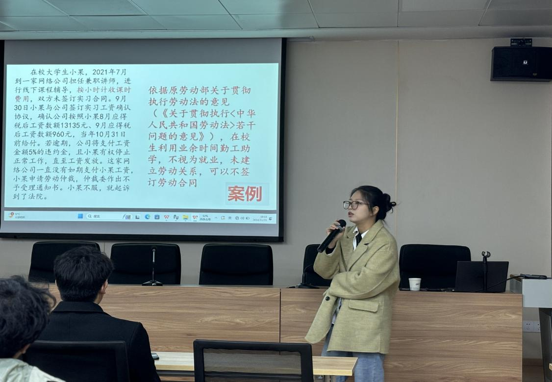 讲座中,黄律师还提到无论是在校期间兼职还是毕业求职,最好要签订书面合,注意辨别条款利弊的同时保护好个人权益;最后还介绍了一些大学生在兼职中涉及盗窃、贷款等违法行为的案例,分析是否构成犯罪及相应量刑情况,寄语同学们“行差莫踏错,踏错悔中过”。