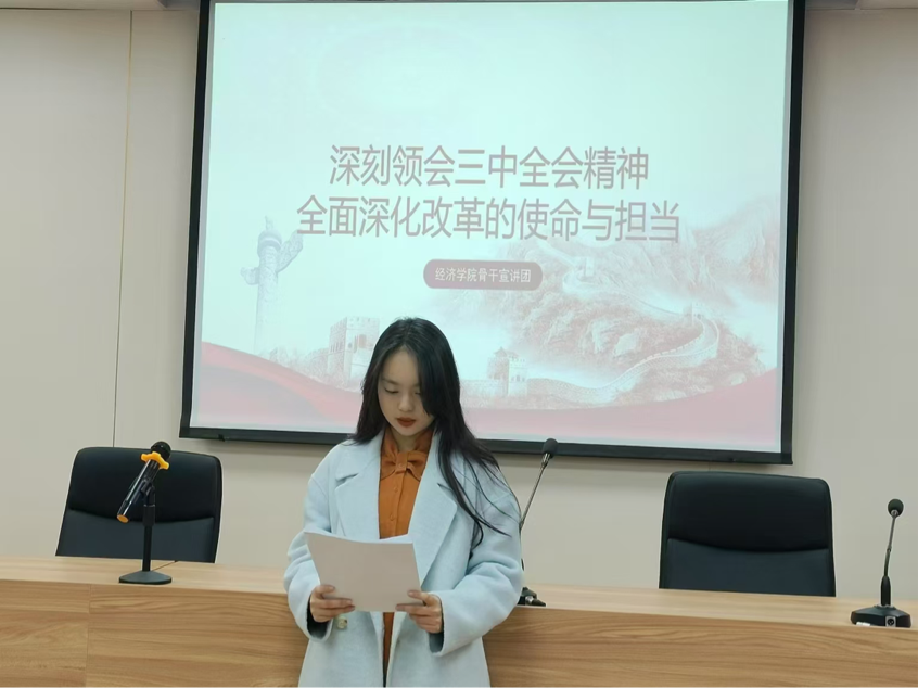 宣讲会上,通过集中观看党的二十届三中全会相关视频、主讲人领读全会精神相关材料以及现场交流等形式,让同学们对全会精神有了更深入的理解。宣讲团成员高子奇、熊磊、胡雪晴依次登台发表演讲,并带领同学们认真学习全会要点,引导青年学子坚持以习近平新时代中国特色社会主义思想为指导,深刻认识全面深化改革的重大意义和使命担当,鼓励同学们脚踏实地,踔厉奋发,积极投身于新时代中国特色社会主义的伟大实践,为祖国的发展贡献自己的力量。同学们纷纷表示,将坚定不移以习近平新时代中国特色社会主义思想为指导,深入贯彻党的二十届三中全会精神,把全面深化改革的使命担当融入到学习和生活当中,努力争做有理想、敢担当、能吃苦、肯奋斗的新时代好青年,以实际行动为实现中华民族伟大复兴的中国梦贡献青春智慧和力量。