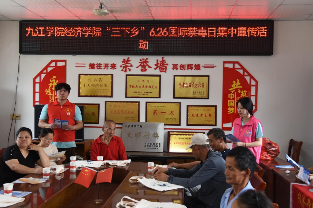 6月26日国际禁毒日当天,永利y23455“万名大学生进千站”志愿服务队再次走进付垅乡开展集中禁毒宣传活动。队员们通过摆放展板、发放资料,向村民讲解毒品危害及防范知识。同时,团队成员分组入户宣传,耐心为村民答疑解惑,并开展调查问卷,了解村民对禁毒知识的认知情况。此次活动有效提升了村民的禁毒意识,增强了识毒、防毒、拒毒能力,为营造无毒乡村环境贡献青春力量。