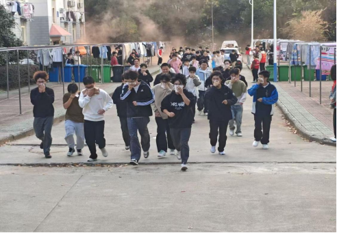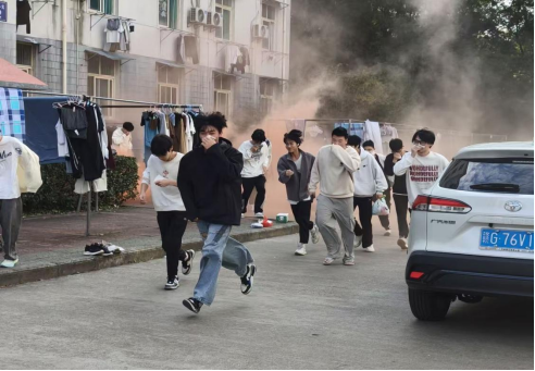 下午2点30分,演习正式启动,楼道内警报响起,烟雾弹同步启动,模拟火灾现场的浓烟迅速弥漫,营造逼真紧张的紧急氛围。接到警示后,各层学生在志愿者引导下,迅速用湿毛巾捂住口鼻,弯腰低姿,沿指定疏散路线快速有序撤离。楼梯转角处,志愿者们沉着提醒“注意脚下、小心踩踏”,全力保障疏散安全。此次疏散全程仅用时约4分钟,全楼学生均安全抵达楼下指定区域,无一人滞留,充分检验了从预警到疏散的完整应急流程。