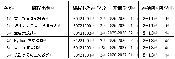 学制1.5年(3个学期),共14.5学分,学生在规定时间内修满培养方案规定的全部课程且考核合格后,可获得yl23455永利集团《量化投资》微专业学习证明书。